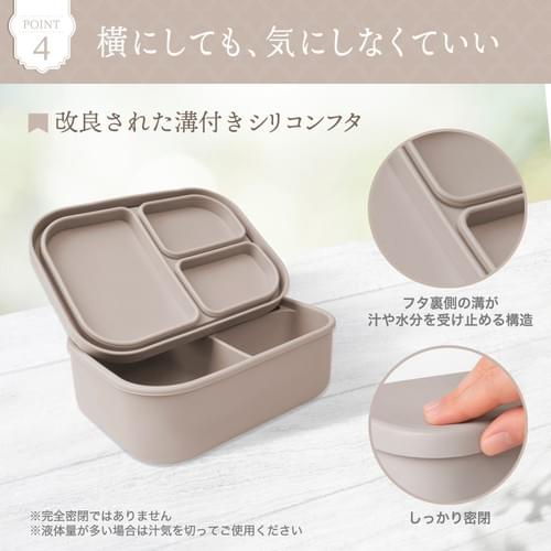 【漏れにくい改良フタ構造|シリコン弁当箱】シリコン製フタの裏側に溝を設けた改良構造。横にしても汁が外に出にくく、通学・通勤時のお弁当箱として安心して持ち運べます。 ※完全密閉ではありません。