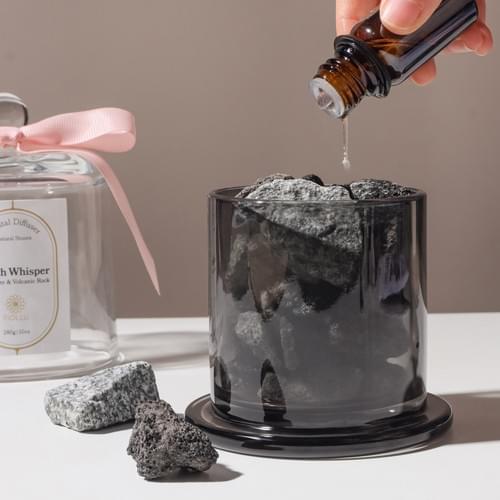 天然石がふんわり香りを広げる(アロマオイル対応) お好みのアロマオイルを2~3滴垂らすだけ。 天然石がオイルを吸収し、火も電源も使わずにやさしく香りが広がります。 *アロマオイルは別売