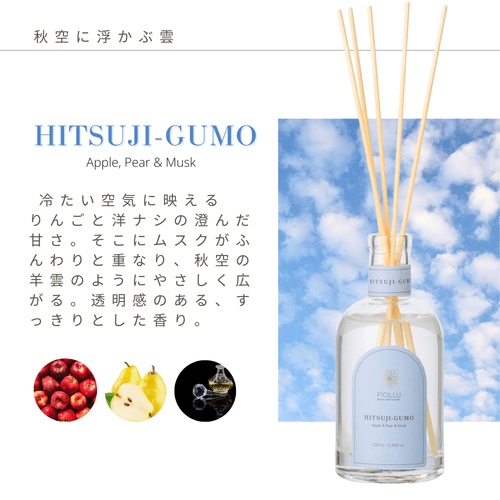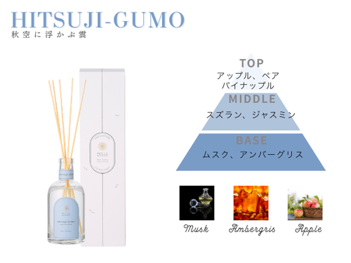 【 HITSUJIGUMO(羊雲)】「りんごと洋梨のすっきりとした甘さに、ムスクがふんわりとけるやわらかな香り。」