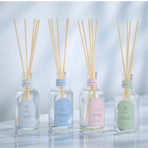 「香りと記憶のつながり」に着目したリードディフューザーシリーズです。アロマセラピストがテーマにしたのは、誰の心にもある“ポジティブな記憶”。初恋のときめき、そよ風のやさしさ、秋空に浮かぶ雲、静かな夜の安らぎ──その記憶に寄り添う4つの香りを丁寧にセレクトしました。